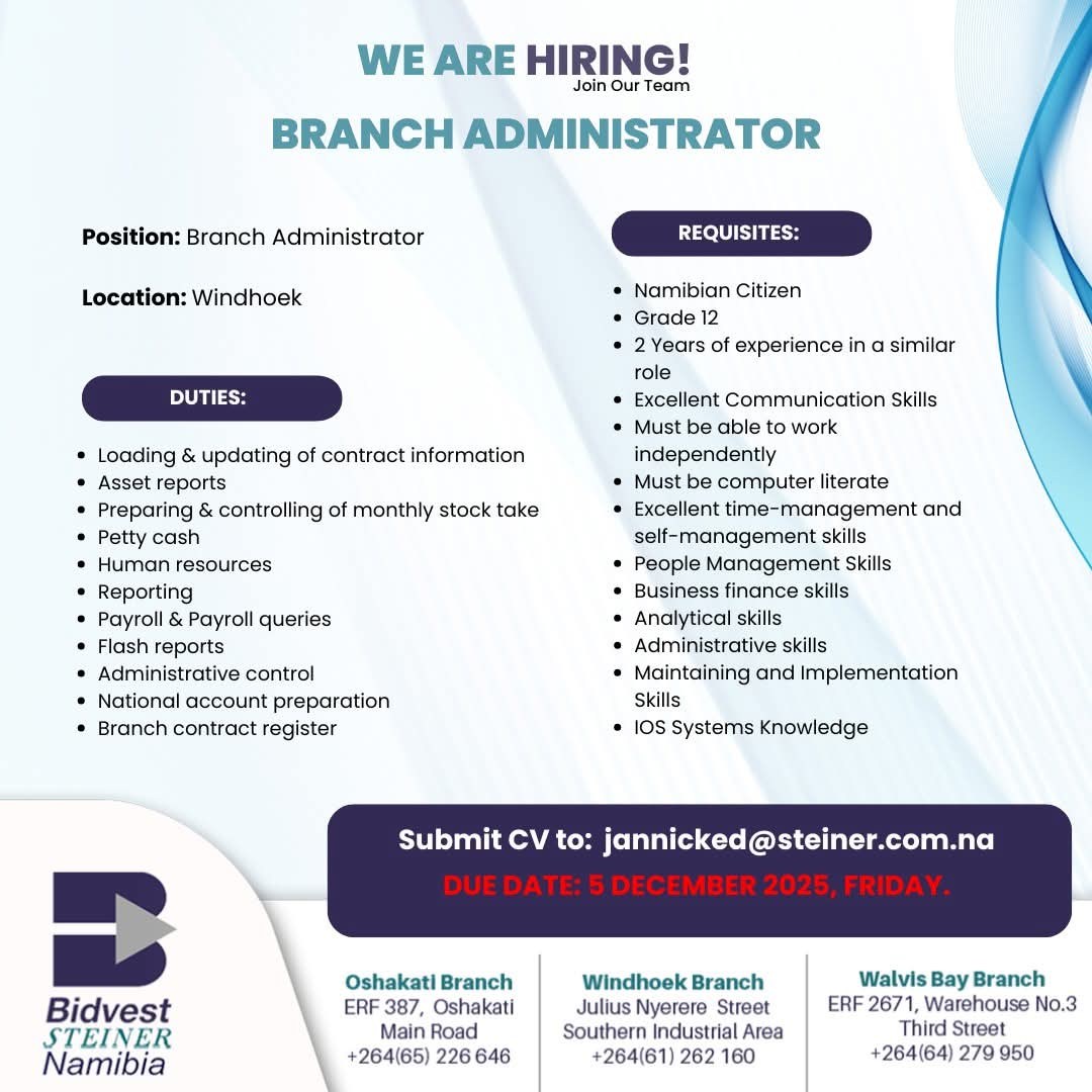 Explore vacant positions like Branch Administrator and numerous other job opportunities available. Submit your application online through the recruitment portal at bidvestnamibia.ci.hr. Thorough, step-by-step guidance is provided on our platform to assist you in applying for Bidvest recruitment openings. Stay updated with daily notifications about the latest job openings and placement announcements.