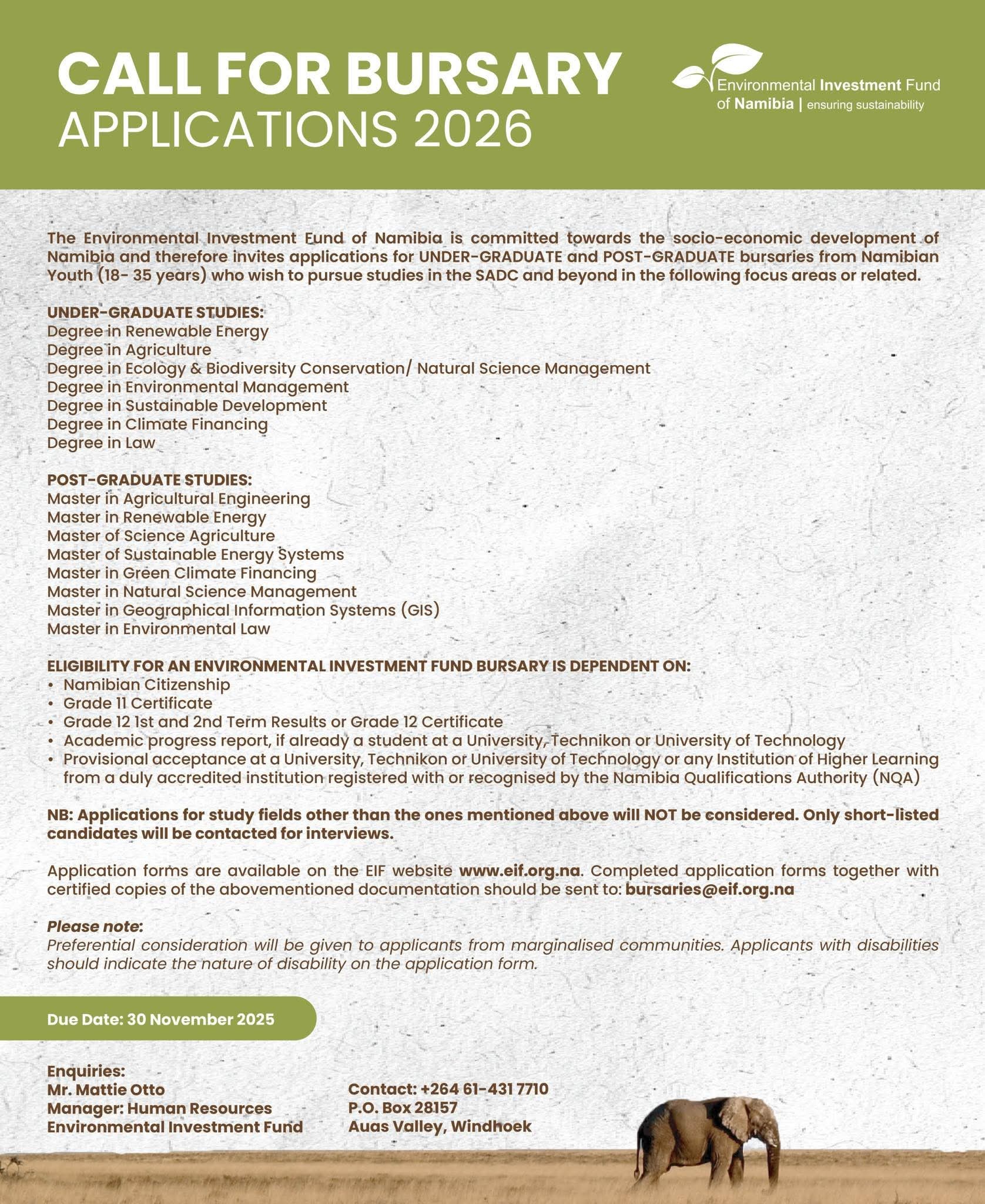 Explore vacant positions like Bursary Applications 2026 and numerous other job opportunities available. Submit your application online through the recruitment portal at www.eif.org.na. Thorough, step-by-step guidance is provided on our platform to assist you in applying for EIF recruitment openings. Stay updated with daily notifications about the latest job openings and placement announcements.