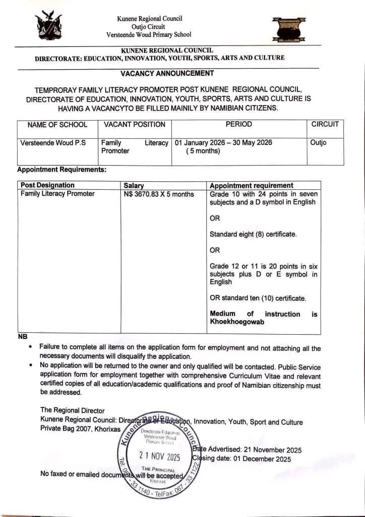 Explore vacant positions like Family Literacy Promoter and numerous other job opportunities available. Submit your application online through the recruitment portal at kunenerc.gov.na. Thorough, step-by-step guidance is provided on our platform to assist you in applying for Kunene Regional Council recruitment openings. Stay updated with daily notifications about the latest job openings and placement announcements.