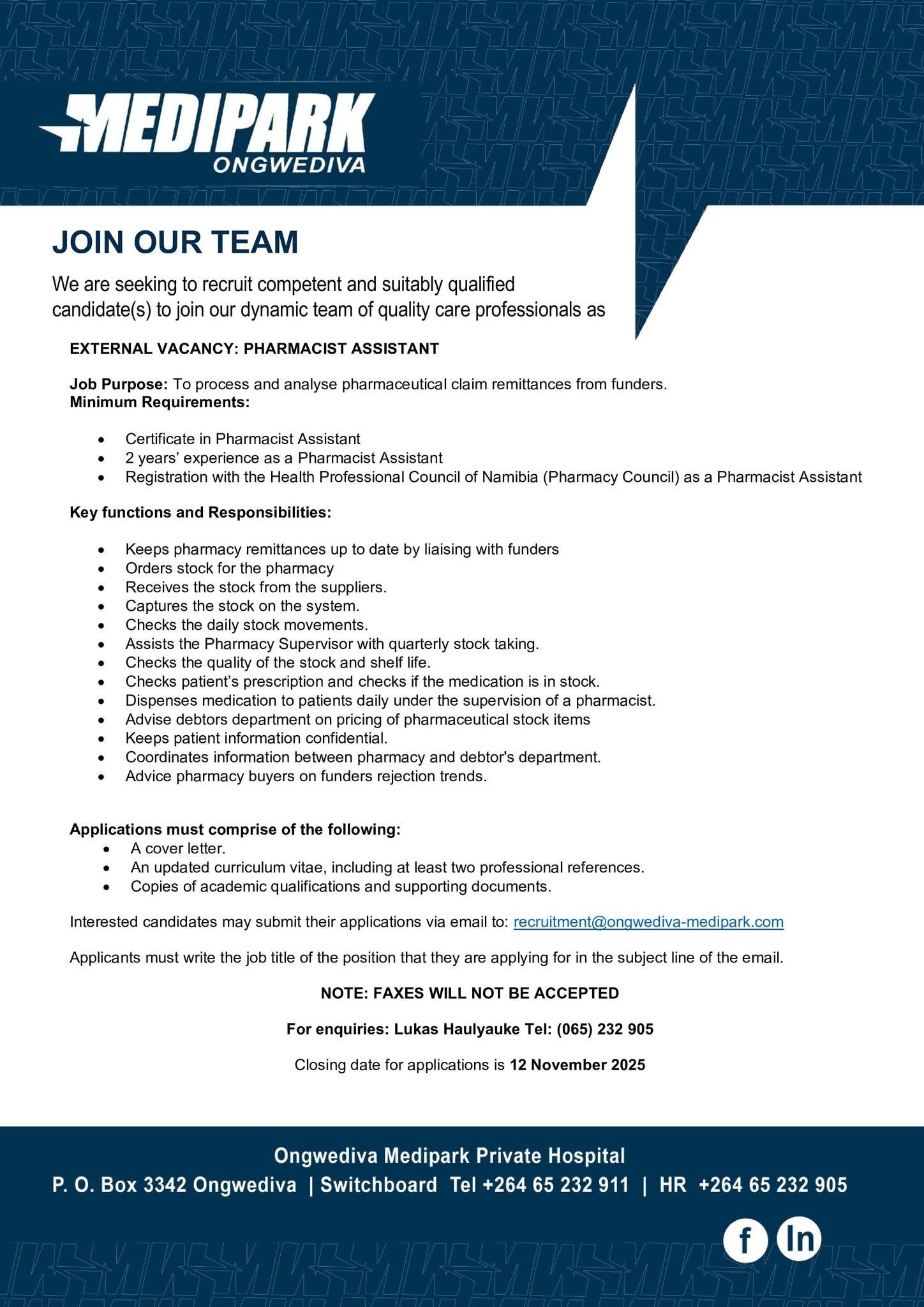 Explore vacant positions like Pharmacist Assistant and numerous other job opportunities available. Submit your application online through the recruitment portal at ongwedivamedipark.com. Thorough, step-by-step guidance is provided on our platform to assist you in applying for Medipark recruitment openings. Stay updated with daily notifications about the latest job openings and placement announcements.