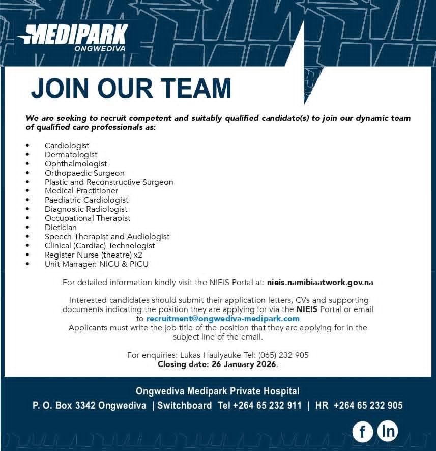 Unlock exciting career opportunities with the latest Medipark Vacancies for 2026! Visit the @ongwedivamedipark.com vacancies Portal to apply for Cardiologist, Dermatologist, Ophthalmologist, Register Nurse, Unit Manager and diverse other roles. Begin your journey toward career growth in Namibia!