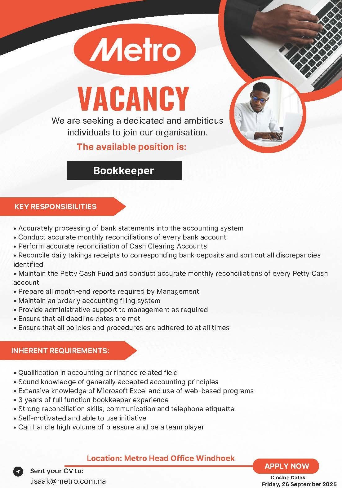 Explore vacant positions like Bookkeeper and numerous other job opportunities available. Submit your application online through the recruitment portal at www.metro.com.na. Thorough, step-by-step guidance is provided on our platform to assist you in applying for Metro Namibia recruitment openings. Stay updated with daily notifications about the latest job openings and placement announcements.