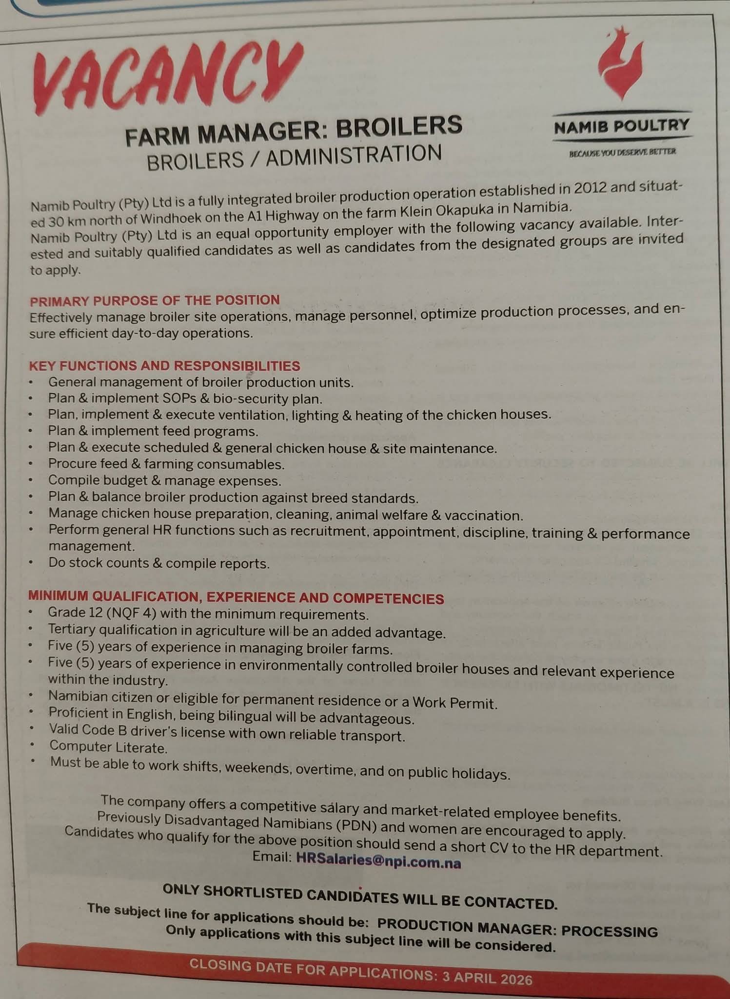 All Active Vacancies Namib Poultry Namibia 2026