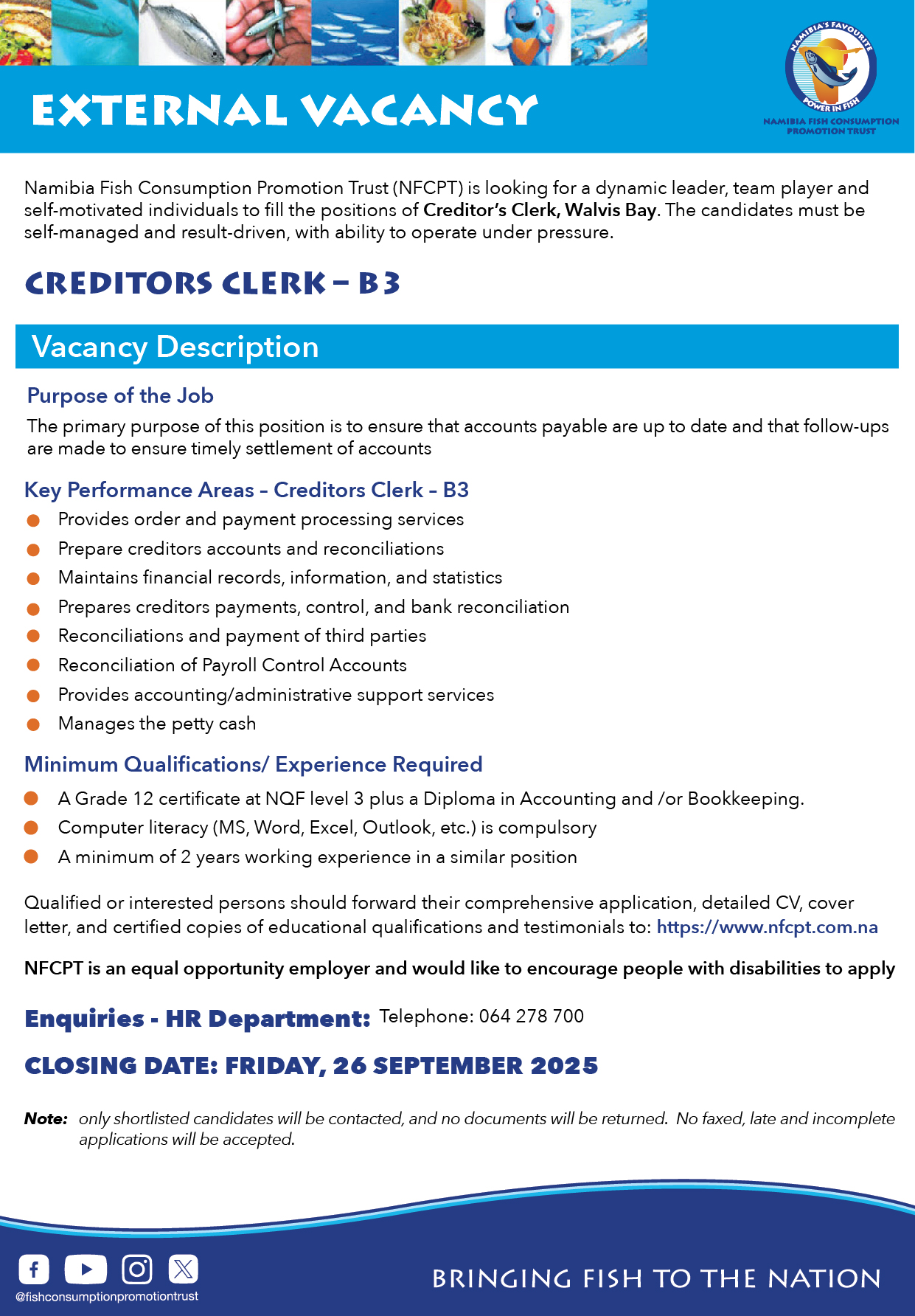 Explore vacant positions like Creditors Clerk and numerous other job opportunities available. Submit your application online through the recruitment portal at www.nfcpt.com.na. Thorough, step-by-step guidance is provided on our platform to assist you in applying for NFCPT recruitment openings. Stay updated with daily notifications about the latest job openings and placement announcements.