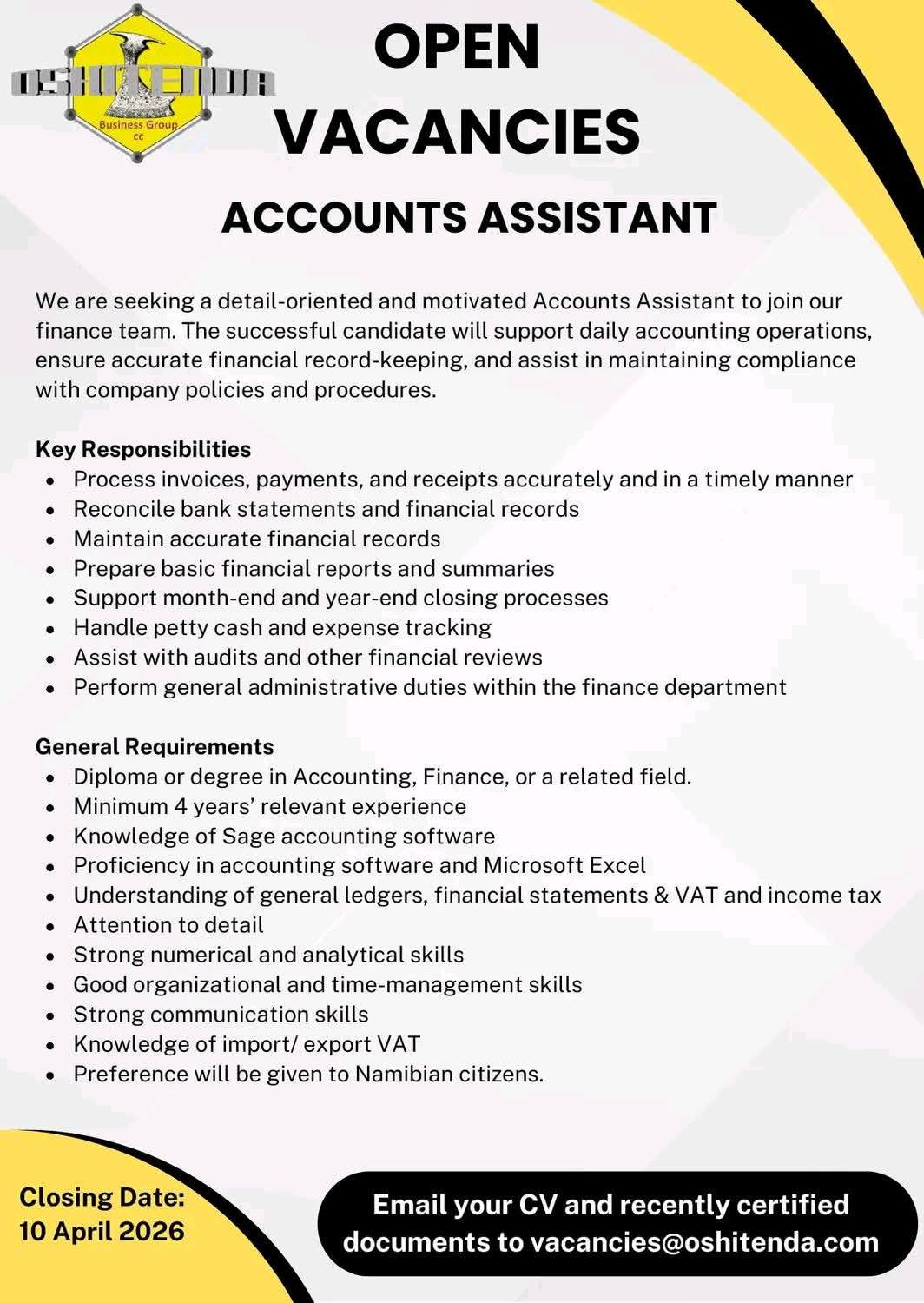 Unlock exciting career opportunities with the latest Oshitenda Business Group Vacancies for 2026! Visit the @www.jobportunities.net vacancies Portal to apply for Accounts Assistant and diverse other roles. Begin your journey toward career growth in Namibia!