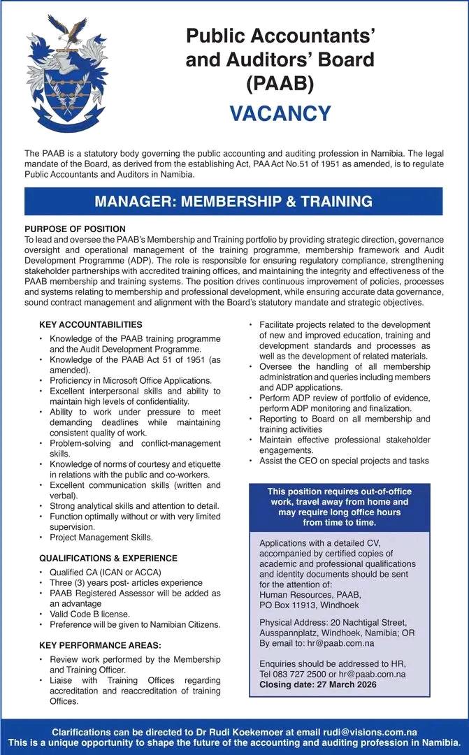 Explore vacant positions like Manager and numerous other job opportunities available. PAAB Vacancies Namibia 2026 also highlights internship positions, particularly in locations such as Windhoek in the Khomas Region, to support students and recent graduates. These roles help applicants gain practical experience and build professional skills, even when specific experience requirements are not explicitly stated in the vacancy notification.