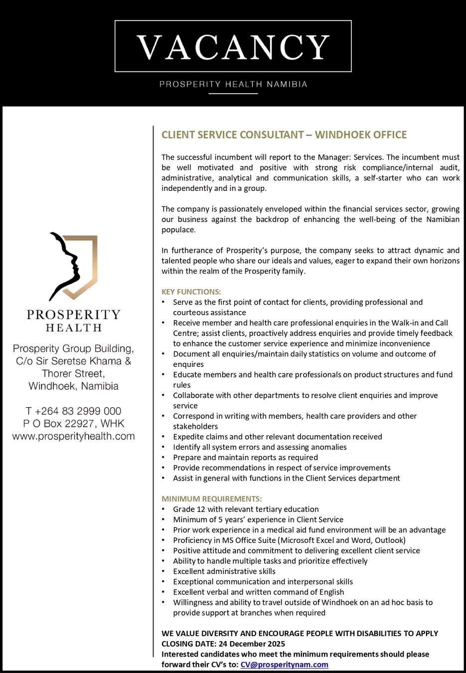 Explore vacant positions like Consultant and numerous other job opportunities available. Prosperity Health Vacancies Namibia 2026 also highlights internship positions, particularly in locations such as Windhoek in the Khomas Region, to support students and recent graduates. These roles help applicants gain practical experience and build professional skills, even when specific experience requirements are not explicitly stated in the vacancy notification.