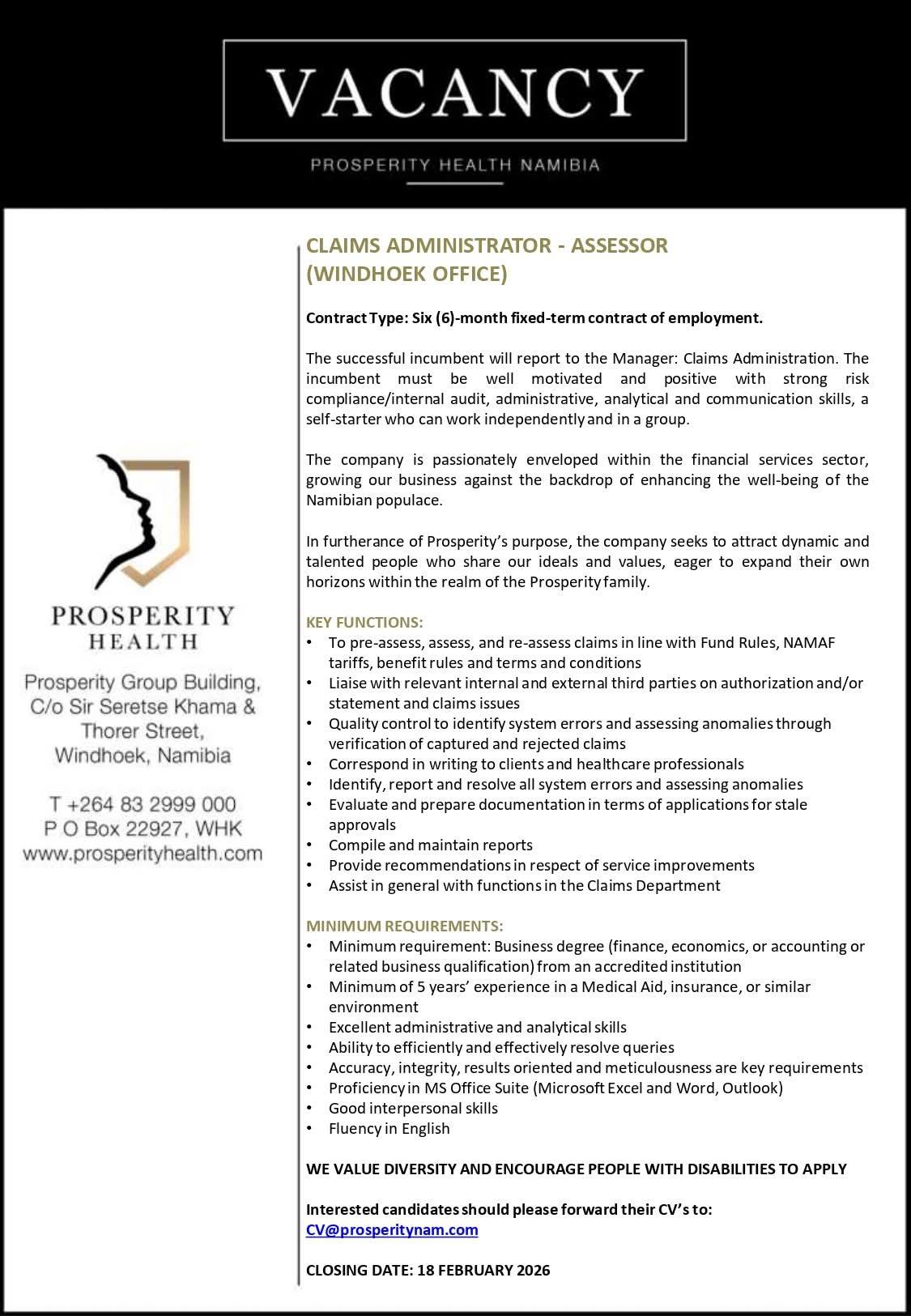 Explore vacant positions like Administrator and numerous other job opportunities available. Prosperity Health Vacancies Namibia 2026 also highlights internship positions, particularly in locations such as Windhoek in the Khomas Region, to support students and recent graduates. These roles help applicants gain practical experience and build professional skills, even when specific experience requirements are not explicitly stated in the vacancy notification.