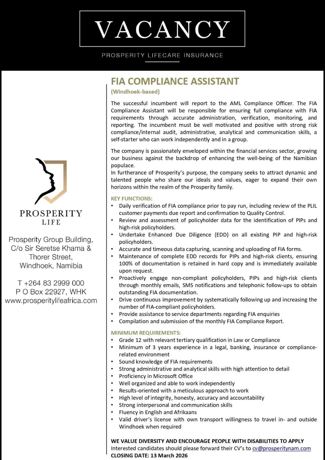 Explore vacant positions like Assistant and numerous other job opportunities available. Prosperity Health Vacancies Namibia 2026 also highlights internship positions, particularly in locations such as Windhoek in the Khomas Region, to support students and recent graduates. These roles help applicants gain practical experience and build professional skills, even when specific experience requirements are not explicitly stated in the vacancy notification.