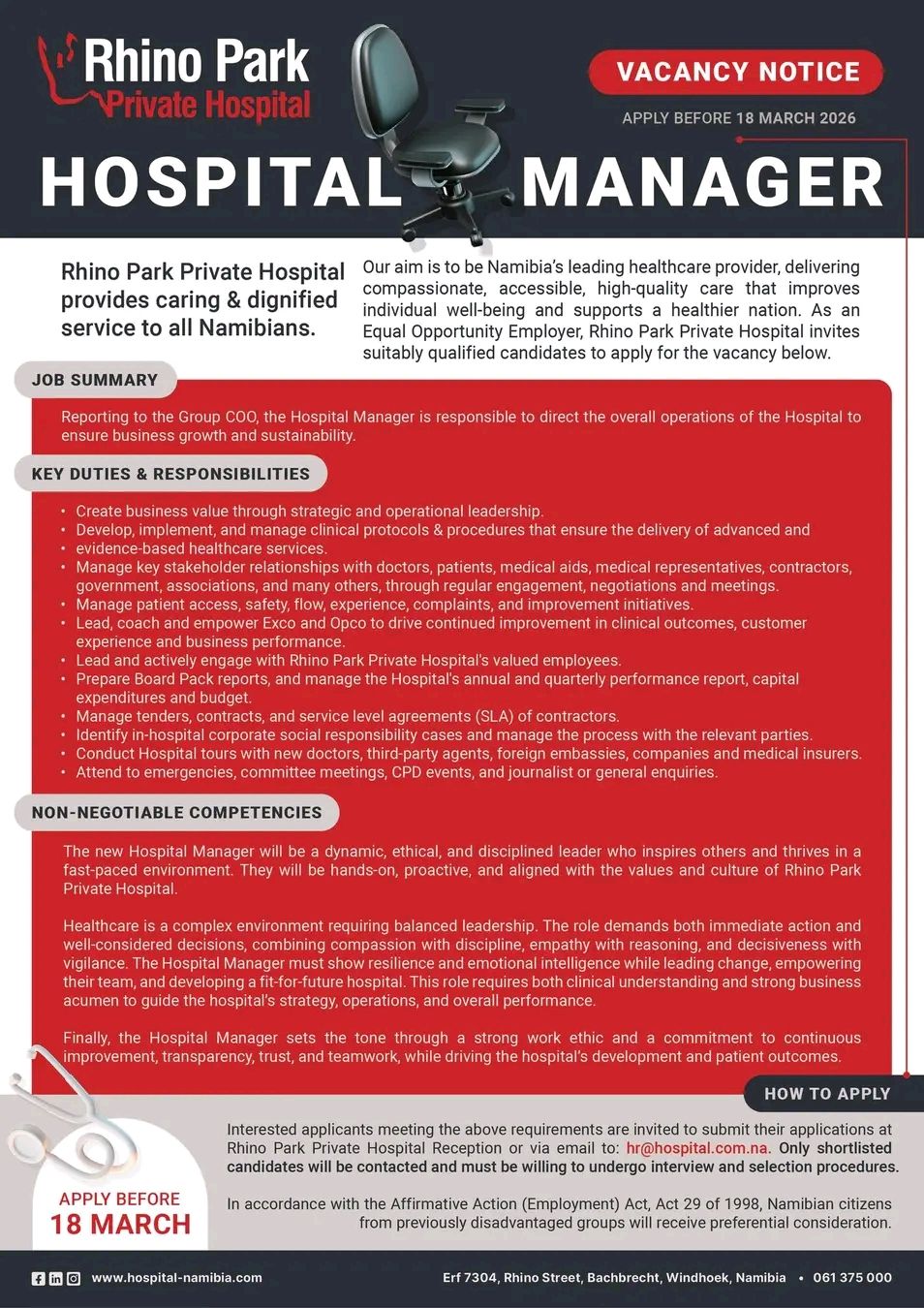 Explore vacant positions like Manager and numerous other job opportunities available. Rhino Park Private Hospital Vacancies Namibia 2026 also highlights internship positions, particularly in locations such as Windhoek in the Khomas Region, to support students and recent graduates. These roles help applicants gain practical experience and build professional skills, even when specific experience requirements are not explicitly stated in the vacancy notification.