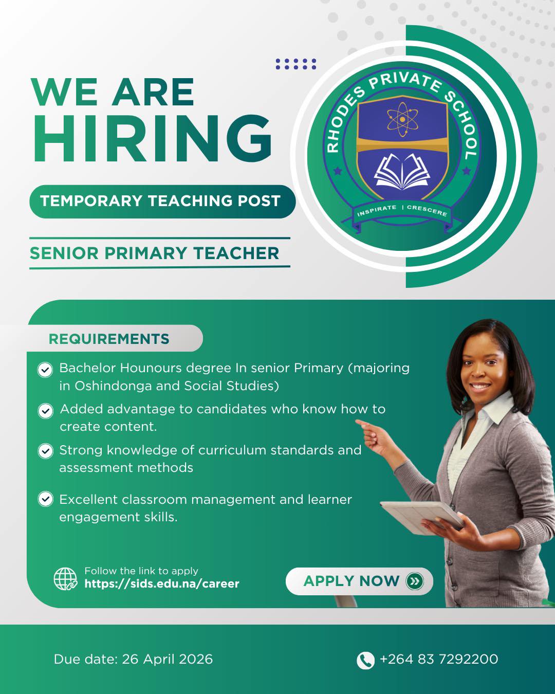 Explore vacant positions like Teacher and numerous other job opportunities available. Rhodes Private School Vacancies Namibia 2026 also highlights internship positions, particularly in locations such as Windhoek in the Khomas Region, to support students and recent graduates. These roles help applicants gain practical experience and build professional skills, even when specific experience requirements are not explicitly stated in the vacancy notification.
