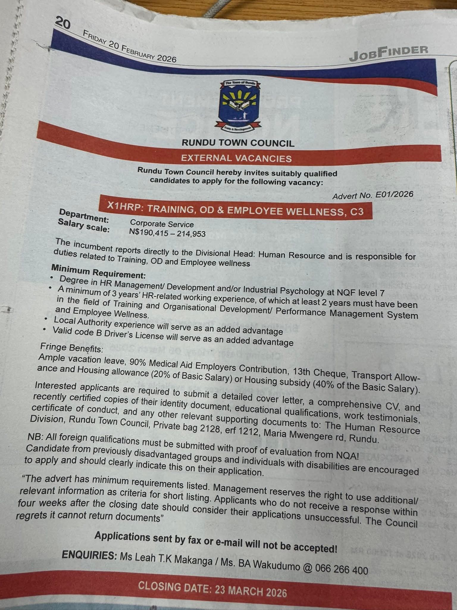 Explore vacant positions like Human Resource Practitioner and numerous other job opportunities available. Rundu Town Council Vacancies Namibia 2026 also highlights internship positions, particularly in locations such as Windhoek in the Khomas Region, to support students and recent graduates. These roles help applicants gain practical experience and build professional skills, even when specific experience requirements are not explicitly stated in the vacancy notification.