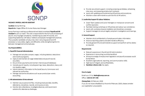 Explore vacant positions like Assistant and numerous other job opportunities available. Sonop Farms Vacancies Namibia 2026 also highlights internship positions, particularly in locations such as Windhoek in the Khomas Region, to support students and recent graduates. These roles help applicants gain practical experience and build professional skills, even when specific experience requirements are not explicitly stated in the vacancy notification.