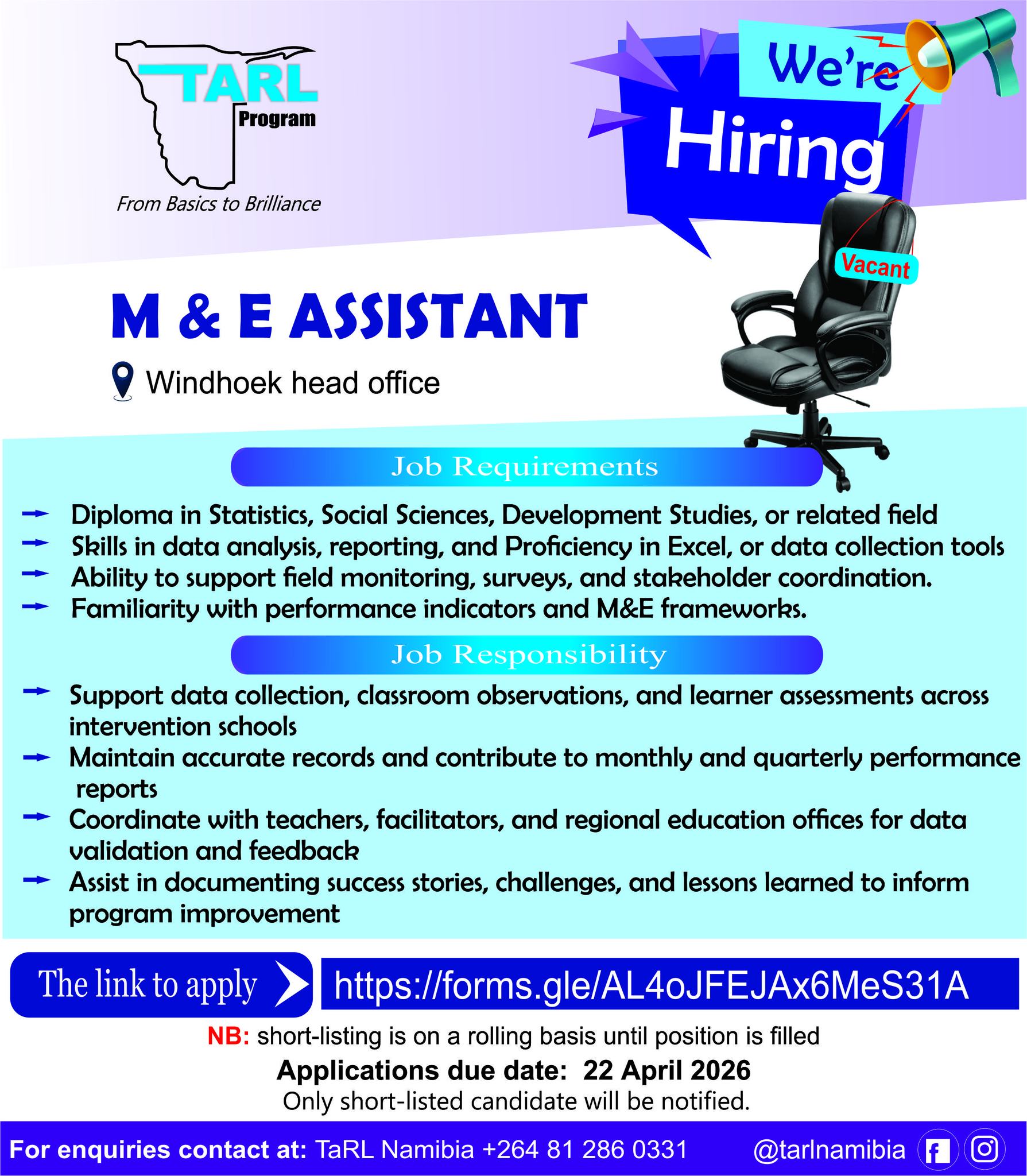 Explore vacant positions like Assistant and numerous other job opportunities available. TaRL Namibia Vacancies Namibia 2026 also highlights internship positions, particularly in locations such as Windhoek in the Khomas Region, to support students and recent graduates. These roles help applicants gain practical experience and build professional skills, even when specific experience requirements are not explicitly stated in the vacancy notification.