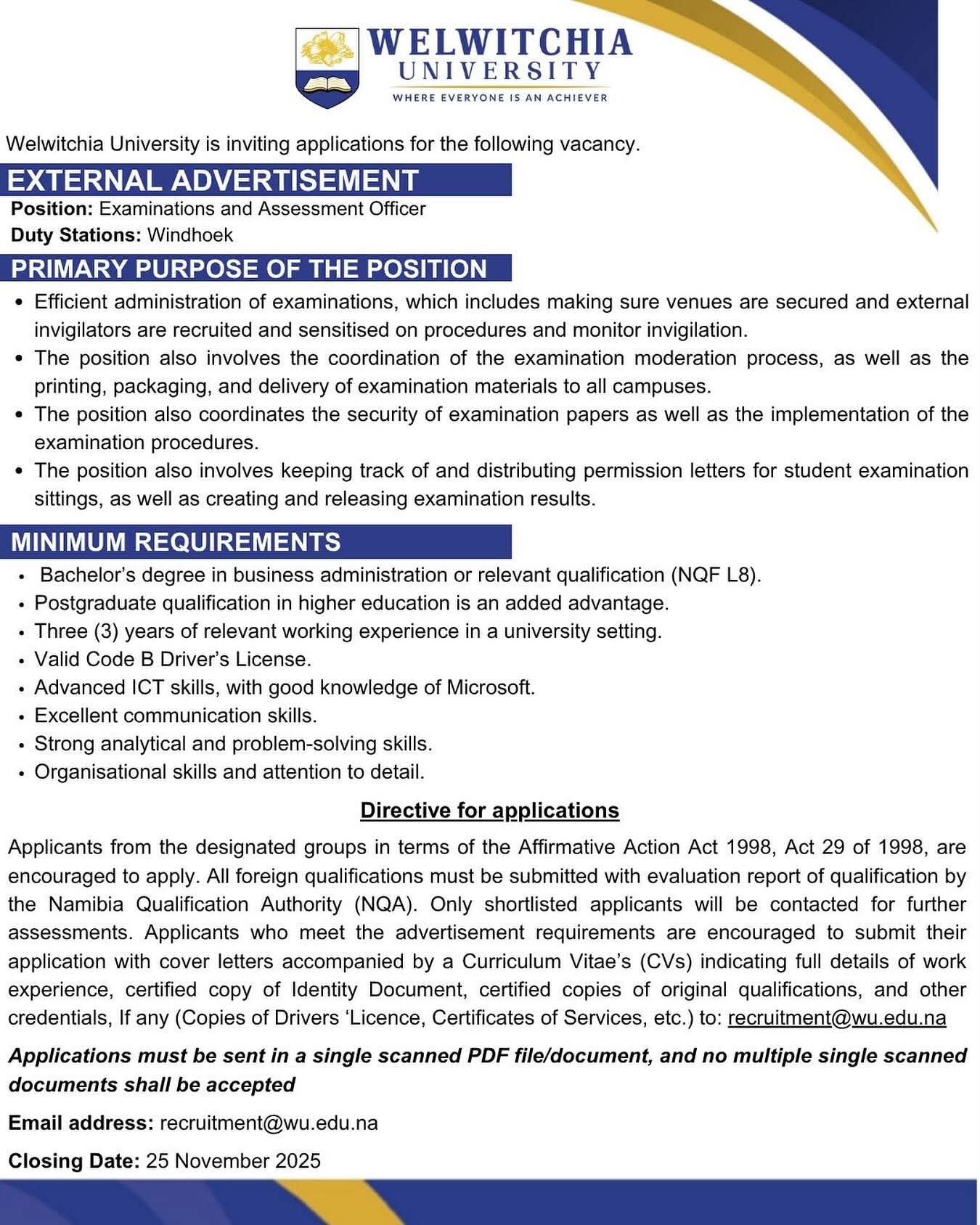Explore vacant positions like Examinations and Assessment Officer and numerous other job opportunities available. Submit your application online through the recruitment portal at www.wu.edu.na. Thorough, step-by-step guidance is provided on our platform to assist you in applying for Welwitchia University recruitment openings. Stay updated with daily notifications about the latest job openings and placement announcements.